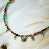 Collana in acciaio inossidabile con tormalina, onice verde, labradorite e ciondoli placcati in oro.