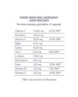 Ingredienti: Acido lascorbico (Vitamina C), pomodoro (Solanum lycopersicum L.) frutto polvere, alfa tocoferolo acetato (Vitamina E), Miglio (Panicum miliaceum L.) frutto e.s., Carota (Daucus carota L.) frutto e.s., Zinco ossido, L cisteina, Limone (Citrus limon (L.) Osbeck) frutto e.s. tit 50% Vit C Acido lipoico, Rame gluconato, riboflavina (vitamina B2), colecalciferolo (Vitamina D3). Agenti antiagglomeranti: Sali di magnesio degli acidi grassi e biossido di silicio. Agente di rivestimento: idrossipropilmetilcellulosa.