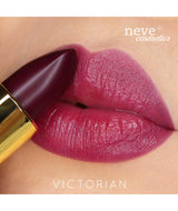 VICTORIAN: Viola profondo che intensifica il colore delle labbra senza banalizzarlo. L'estratto di meadowfoam e la fragranza di violette evocano romanzi gotici, brughiera inglese ed eleganza d'altri tempi.