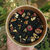 Ingredienti: tè nero, scorze di arancio, pezzetti di cranberry, mandorle, cardamomo, aroma, fragole liofilizzate, lamponi liofilizzati, cranberry liofilizzati