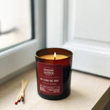 Candela in cera di soia presentata in un vaso di vetro ambrato che diffonde una luce soffusa e calda.